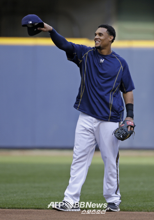 | 밀워키 외야수 카를로스 고메스가 31일(한국시각) 휴스턴으로 트레이드됐다. 이날 시카고 컵스와의 경기를 앞두고 동료들을 향해 모자를 벗고 인사하고 있는 고메스. ⓒAFPBBNews = News1 |