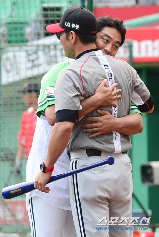 수줍게 웃으며 인사를 한 정의윤은 먼저 1루에 있던 유지현 코치와 반갑게 악수를 나눴다. 서용빈 코치와는 뜨거운 포옹으로 반가움을 표시한 정의윤은 그라운드에 있던 코치와 선수들과 일일이 악수를 나눴다.