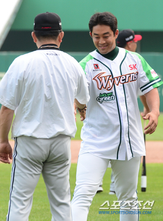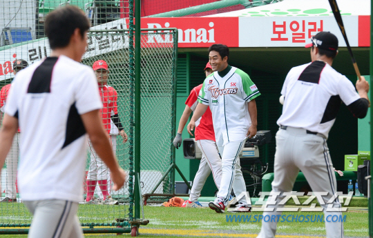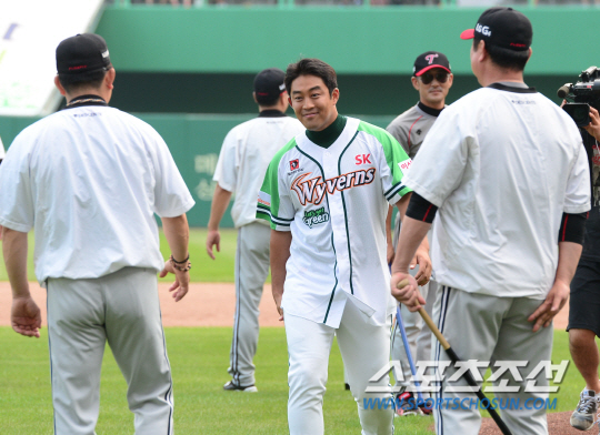 31일 인천 LG와 SK 전을 앞두고 SK 유니폼을 말끔하게 차려입은 정의윤이 그라운드로 나와 훈련 중인 LG 선수단을 찾았다.