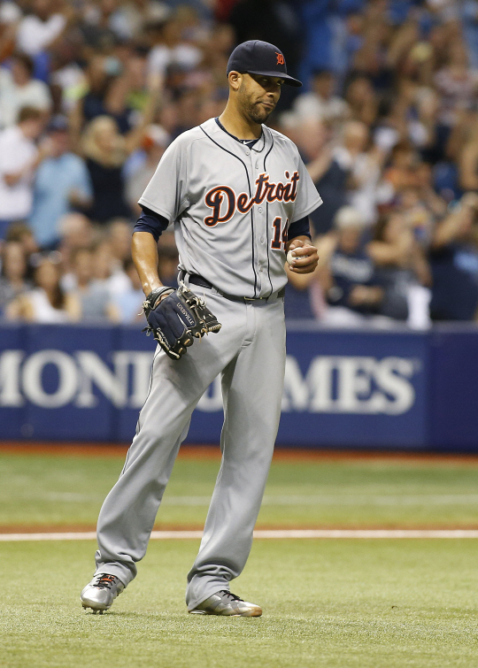 | ST. PETERSBURG, FL - JULY 28: Pitcher David Price #14 of the Detroit Tigers reacts on the field after allowing a two-run home run by Curt Casali #19 of the Tampa Bay Rays during the fourth inning of a game on July 28, 2015 at Tropicana Field in St. Petersburg, Florida. Brian Blanco/Getty Images/AFP |