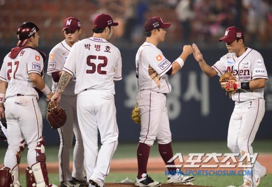 | 2015 프로야구 kt 위즈와 넥센 히어로즈의 주중 3연전 3차전이 30일 목동구장에서 열렸다. 넥센이 10-6의 승리를 거둔 가운데 승리를 자축하고 있다. 정재근 기자 cjg@sportschosun.com/2015.07.30/ |