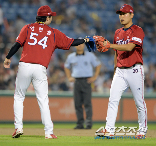 한화와 KIA의 2015 KBO 리그 주말 3연전 마지막 경기가 2일 대전 한화생명 이글스파크에서 열렸다. 9회말 1사 2루 KIA 양현종이 마운드를 내려가며 윤석민과 하이파이브를 하고 있다. 대전=허상욱 기자 wook@sportschosun.com/2015.08.02/