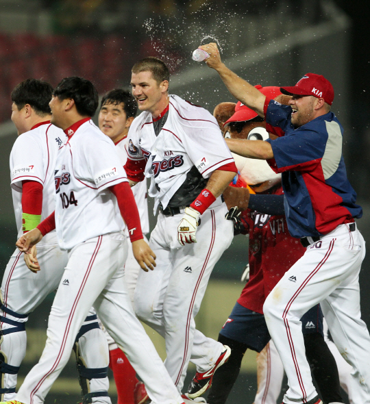 7월 29일 광주 기아챔피언스필드에서 열린 SK 와이번스전에서 KIA 브렛필이 9회말 2사 만루에서 역전 끝내기 안타를 때렸다. 최근 팀에 합류한 에반 믹이 필에게 물을 들이붓고 있다. 사진제공=KIA 타이거즈