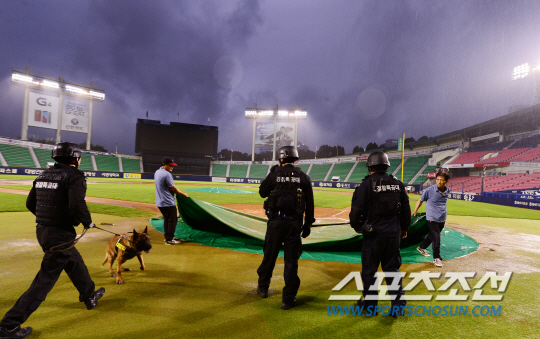 23일 LG와 넥센의 잠실 경기가 열릴 잠실 야구장에는 경찰이 출동하는 해프닝이 벌어 졌다. 잠실 야구장에 폭발물이 설치 됐다는 신고를 받은 경찰이 폭발물 탐지견과 함께 잠실 야구장 본부석을 샅샅이 뒤졌다. 비로 경기가 취소 되지 않았더라면 폭발물을 찾기 위해 경기가 중단 되는 초유의 사태가 벌어질 뻔 했다. 잠실=조병관기자 rainmaker@sportschosun.com/2015.07.23/ |