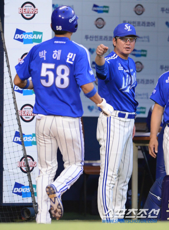 31일 오후 서울 잠실야구장에서 2015 프로야구 삼성과 두산의 경기가 열렸다. 3회초 무사 1루서 1루주자 박해민이 나바로의 좌전 안타 때 홈에 들어온 후 류중일 감독과 하이파이브를 나누고 있다. 잠실=김경민 기자 kyungmin@sportschosun.com