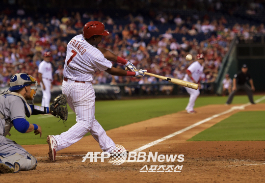 | 필라델피아 필리스의 마이켈 프랑코가 5일(한국시각) LA 다저스와의 경기에서 7회말 결승 만루홈런을 터뜨리고 있다. ⓒAFPBBNews = News1 |