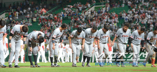 SK와 한화의 2015 KBO 리그 경기가 5일 인천 SK행복드림구장에서 열렸다. SK가 7대3으로 승리를 거두며 3연승을 달렸다. 5연패에 빠진 한화 선수단이 팬들에게 인사를 하고 있다. 인천=허상욱 기자 wook@sportschosun.com/2015.08.05/ |