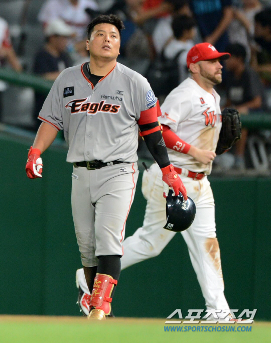 SK와 한화의 2015 KBO 리그 경기가 5일 인천 SK행복드림구장에서 열렸다. 7회초 1사 1,3루 한화 김태균이 병살타로 물러나며 아쉬워하고 있다. 인천=허상욱 기자 wook@sportschosun.com/2015.08.05/ |
