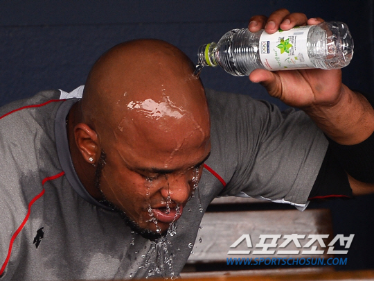 11일 잠실구장에서 KBO리그 LG 트윈스와 한화 이글스와 주말 3연전 두 번째 경기가 펼쳐진다. 경기 전 LG 선수들이 훈련에 임하고 있다. LG 히메네스가 무더운 날씨에 물을 머리에 부으며 더위를 식히고 있다. 잠실=송정헌 기자 songs@sportschosun.com/2015.07.11 |