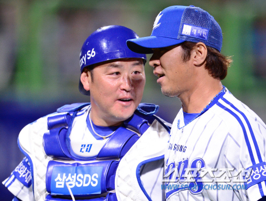 | 삼성 포수 진갑용과 임창용이 얘기를 나누는 모습. 진갑용이 6일 사실상 은퇴하고 전력분석원으로 변신하기로 공식 발표했다. 김경민 기자 kyungmin@sportschosun.com / 2015.06.04. |