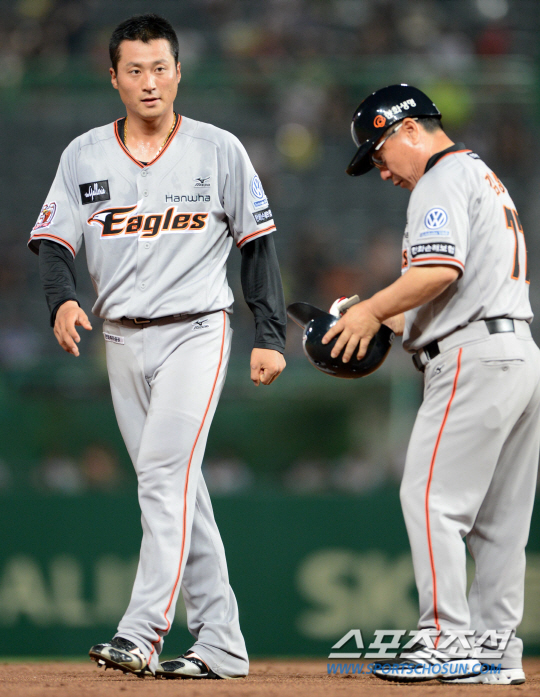 SK와 한화의 2015 KBO 리그 경기가 5일 인천 SK행복드림구장에서 열렸다. 7회초 2사 우전안타를 쳐낸 한화 정현석이 이닝이 교체된 후 김광수 3루 코치에게 장비를 건네고 있다. 인천=허상욱 기자 wook@sportschosun.com/2015.08.05/