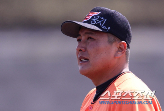 ◇지난 2월 오키나와 스프링캠프 때 정현석의 쾌유를 기원하며 그의 별명인 '뭉치'를 모자에 써넣은 한화 이글스 주장 김태균의 모습. 스포츠조선 DB