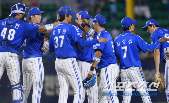 2015 KBO리그 두산베어스와 삼성라이온즈의 경기가 1일 서울잠실야구장에서 열렸다. 삼성 선수들이 두산을 상대로 7대3 승리를 거둔후 하이파이브 하고 있다. 잠실=최문영 기자 deer@sportschosun.com /2015.08.01/