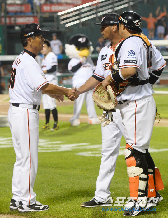 2015 KBO리그 한화이글스와 LG트윈스의 경기가 6일 대전 한화생명 이글스파크에서 열렸다. 한화 선발투수 로저스가 9이닝 1실점으로 완투승을 거둔후 김성근 감독과 하이파이브 하고 있다. 대전=최문영 기자 deer@sportschosun.com