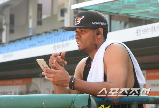 2015 KBO리그 한화이글스와 LG트윈스의 경기가 7일 대전 한화생명 이글스파크에서 열렸다. 경기전 한화 로저스가 훈련을 마친뒤 음악을 들으며 휴식을 취하고 있다. 대전=최문영 기자 deer@sportschosun.com