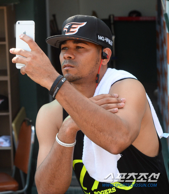 2015 KBO리그 한화이글스와 LG트윈스의 경기가 7일 대전 한화생명 이글스파크에서 열렸다. 경기전 한화 로저스가 훈련을 마친뒤 음악을 들으며 휴식을 취하고 있다. 대전=최문영 기자 deer@sportschosun.com