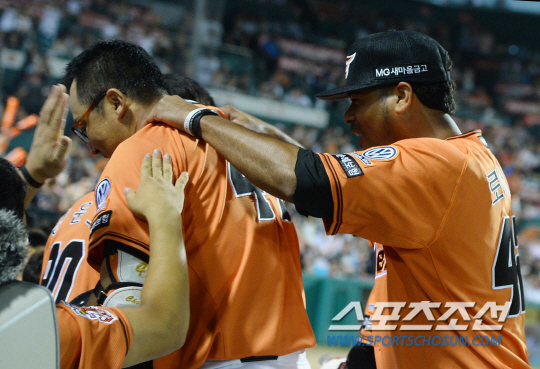 2015 KBO리그 한화이글스와 롯데자이언츠의 경기가 8일 대전 한화생명 이글스파크에서 열렸다. 한화 로저스가 8회말 동점 3점홈런을 친 조인성을 환영하고 있다. 대전=최문영 기자 deer@sportschosun.com