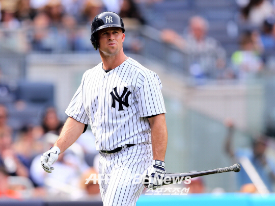 뉴욕 양키스 외야수 브렛 가드너가 경기 도중 팬이 그라운드로 던진 홈런공에 맞는 아찔한 순간을 경험했다. 사진은 지난 9일(한국시각) 토론토 블루제이스전에서 8회 삼진을 당한 가드너. ⓒAFPBBNews = News1