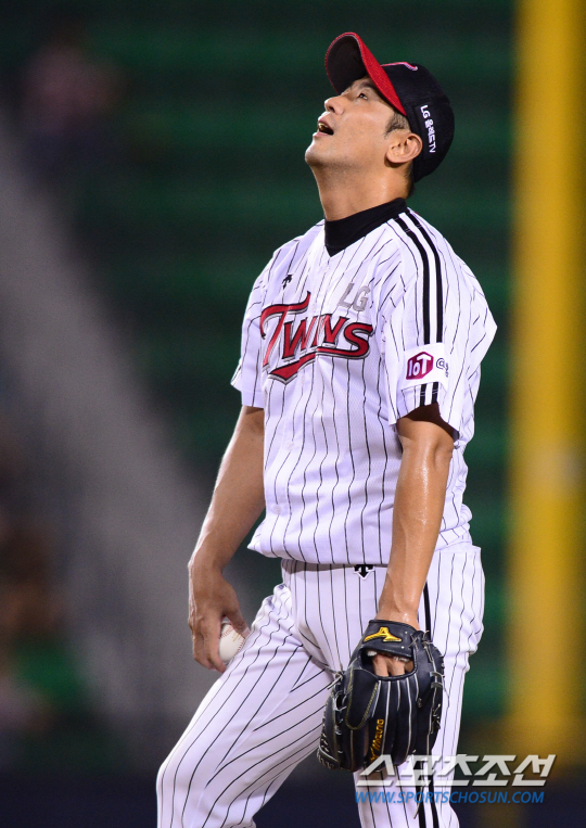 2015 프로야구 LG와 삼성의 경기가 11일 잠실에서 열렸다. LG 선발 김광삼이 무실점 호투를 이어오다 5회 2사 만루에서 삼성 박해민에게 적시타를 허용하고 아쉬워 하고 있다. 잠실=조병관기자 rainmaker@sportschosun.com/2015.08.11/ |