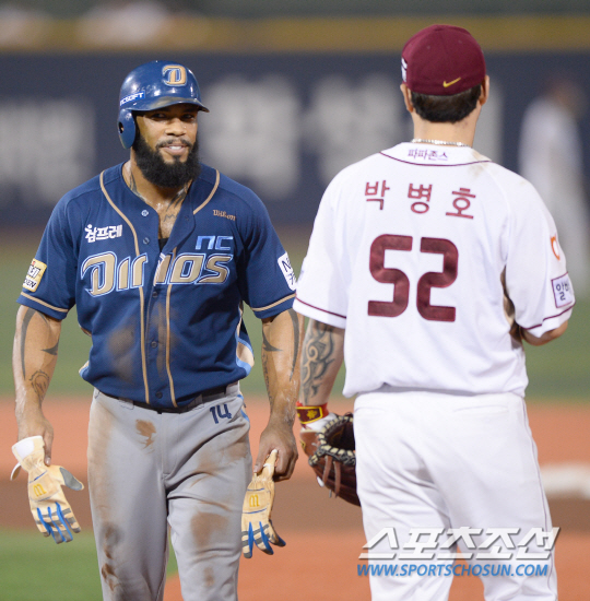 이날 둘은 나란히 1루수로 선발출전해 상대의 홈런장면을 여과없이 지켜봤다. 홈런을 치고 1루를 돌 때는 번갈아가며 무표정한 얼굴로 상대를 응시하기도 했다. 이날 박병호는 테임즈가 사이클링 히트에 성공하자 슬쩍 눈인사로 축하를 했다. 테임즈는 배팅장갑으로 박병호의 엉덩이를 툭툭치며 친근감을 표했다. 피말리는 승부의 세계지만 최고타자들은 서로를 격려하며 그렇게 함께 더 높은 곳을 향해 달려가고 있었다. 엄밀히 말하면 테임즈의 판정승으로 봐도 좋을 듯하다. NC는 난타전끝에 9대8로 신승했다. 박재호 기자 jhpark@sportschosun.com
