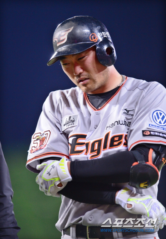 ◇한화 이글스 송광민이 지난 4월29일 광주 KIA전 때 5회초 안타를 친 뒤 생긴 팔꿈치 통증 때문에 고통스러운 표정을 짓고 있다. 송광민은 이후 재활군으로 내려가 아직도 복귀하지 못하고 있다. 광주=김경민 기자 kyungmin@sportschosun.com