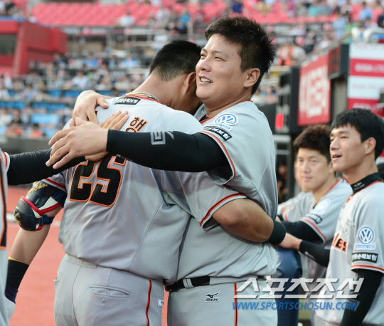 2015 프로야구 한화 이글스와 kt 위즈의 주중 3연전 2차전이 12일 수원 kt위즈파크에서 열렸다. 1회초 2사 1루 한화 최진행이 중월 투런포를 치고 들어와 김태균의 품에 안기고 있다. 한화는 선발투수로 4승 5패 방어율 6.45의 송창식을 내세웠다. kt는 1패 방어율 8.41의 주권이 선발 등판했다. 수원=정재근 기자 cjg@sportschosun.com/2015.08.12/