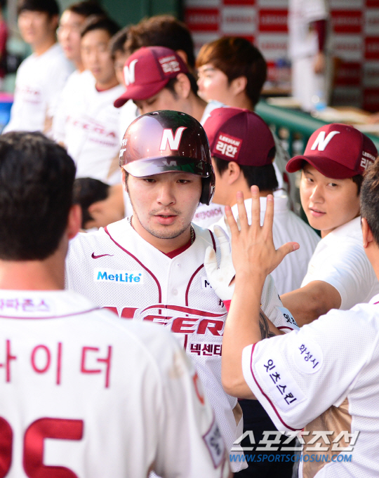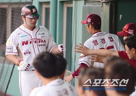 12일 서울 목동구장에서 KBO리그 넥센 히어로즈와 NC 다이노스의 경기가 열렸다. 넥센 김택형와 NC 이태양이 선발 맞대결을 펼쳤다. 넥센 박병호가 1회 NC 이태양을 상대로 시즌 41호 솔로홈런을 날렸다. 덕아웃에서 동료들과 하이파이브를 나누고 있는 박병호. 목동=송정헌 기자 songs@sportschosun.com