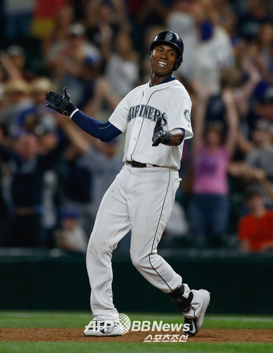| 시애틀 매리너스 오스틴 잭슨이 지난 12일(한국시각) 열린 볼티모어 오리올스전에서 연장 10회 끝내기 안타를 친 뒤 기뻐하고 있다. 이날 열린 메이저리그 15경기는 역사상 처음으로 모두 홈팀의 승리로 끝났다. ⓒAFPBBNews = News1 |