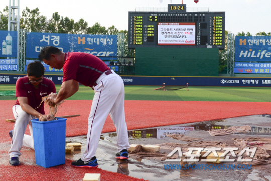 이날 목동구장에는 한화의 훈련 시간이던 오후 4시45분경 갑작스러운 폭우가 쏟아졌다. 일시적인 소나기라 약 15분 후에 그쳤지만, 워낙에 짧은 시간에 많은 비가 내렸다. 이로 인해 인조잔디 구장인 목동 그라운드는 물에 흠뻑 젖었다. 홈플레이트와 마운드, 1~3루 베이스를 방수포로 덮었음에도 비에 흠뻑 젖었다. 더구나 잔디쪽에 물이 흥건히 고여 정상적인 경기를 치르기 위해서는 전면적인 정비가 필요했다.