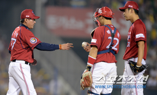 LG와 KIA의 2015 KBO 리그 경기가 15일 잠실구장에서 열렸다. 9회초 1사 3루 KIA 김기태 감독이 마운드에 올라 윤석민과 이야기를 하고 있다. 잠실=허상욱 기자 wook@sportschosun.com/2015.08.15/
