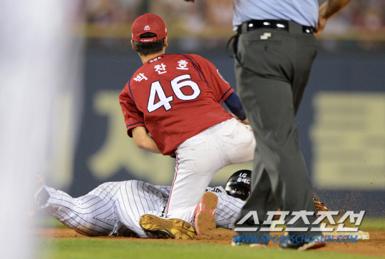 LG와 KIA의 2015 KBO 리그 경기가 15일 잠실구장에서 열렸다. 9회말 1사 1,2루 LG 이진영 타석때 2루주자 박용택이 KIA 윤석민의 견제에 아웃되고 있다. 잠실=허상욱 기자 wook@sportschosun.com/2015.08.15/