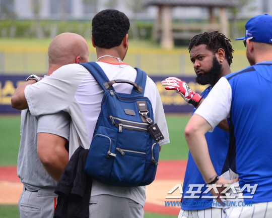 16일 오후 포항 야구장에서 열릴 2015 프로야구 한화와의 경기에 앞서 삼성 나바로가 로저스, 폭스와 이야기를 나누고 있다.. 셋은 예전 도미니칸 윈터리그에서 같은 팀 동료로 뛰었다. 포항=김경민 기자 kyungmin@sportschosun.com / 2015.08.16. |