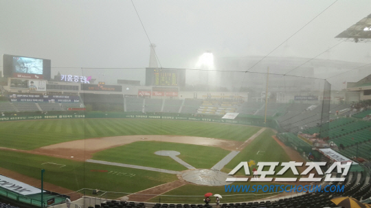 삽시간에 그라운는 물로 뒤덮혔다. 오후 6시 시작 예정인 경기의 정상적인 진행이 불가능한 상태다. 경기 전 우천취소 여부는 경기 감독관이 판단한다. 하지만 경기시각이 넘어간 시점에서는 심판진의 판단에 의해 경기 속개 여부가 결정된다. 인천=류동혁 기자 sfryu@sportschosun.com