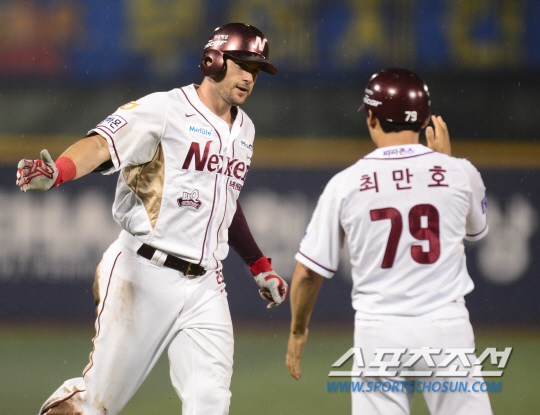 2015 프로야구 한화 이글스와 넥센 히어로즈의 경기가 13일 목동구장에서 열렸다. 8회말 무사 1루 넥센 스나이더가 중월 투런포를 치고 들어오며 축하를 받고 있다. 한화는 선발투수로 2승 6패 방어율 7.71의 송은범을 내세웠다. 넥센에서는 8승 8패 방어율 4.56의 피어밴드가 선발 등판했다. 목동=정재근 기자 cjg@sportschosun.com