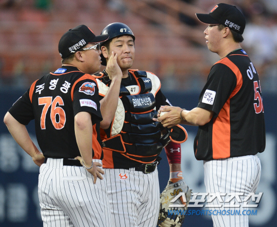 2015 프로야구 롯데 자이언츠와 넥센 히어로즈의 경기가 17일 목동구장에서 열렸다. 2회말 2사 만루 넥센 박동원 타석에서 주형광 코치와 강민호 포수가 마운드에 올라가 이재곤을 진정시키고 있다. 롯데는 선발투수로 시즌 1패 방어율 4.09의 이재곤을 내세웠다. 넥센은 3승 5패 방어율 4.96의 김영민이 선발 등판했다. 목동=정재근 기자 cjg@sportschosun.com