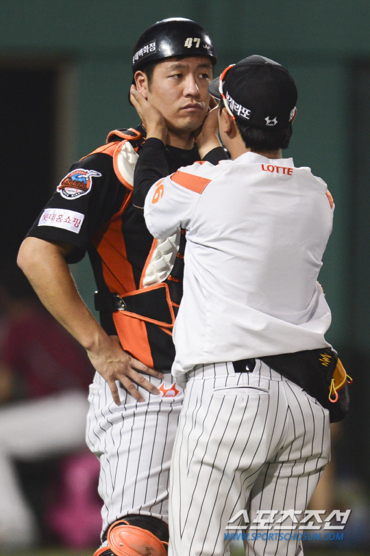 급하게 트레이너가 뛰어나왔고, 김민호 수석코치가 강민호의 상태를 점검했다. 김 코치가 덕아웃에 들어가 이종운 감독과 최종적으로 논의를 했고, 결국 강민호를 김준태로 교체했다.