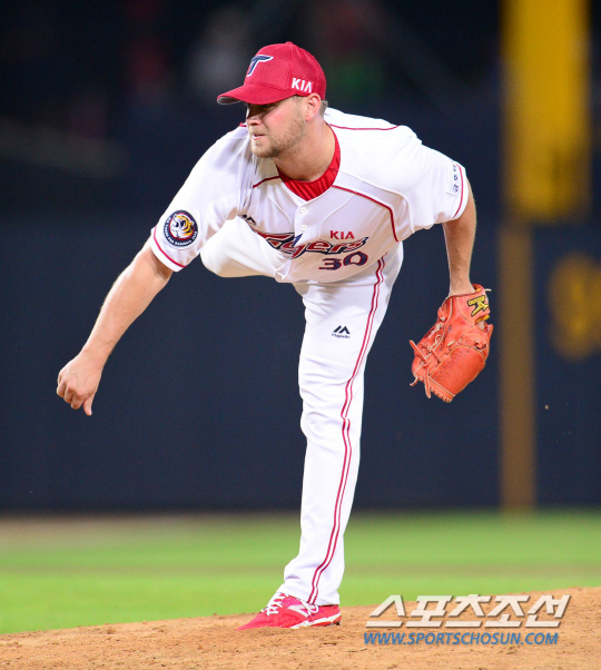 | 13일 오후 광주 기아챔피언스필드에서 2015 프로야구 삼성과 KIA의 경기가 열렸다. KIA 에반이 힘차게 볼을 던지고 있다. 광주=김경민 기자 kyungmin@sportschosun.com / 2015.08.13. |