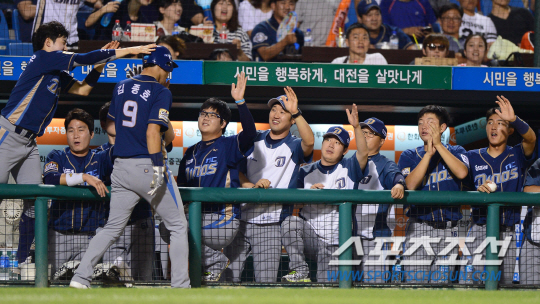18일 대전 한화생명이글스파크에서 KBO리그 한화 이글스와 NC 다이노스의 경기가 열렸다. NC 8회 1사 1,3루에서 이호준이 1타점 적시타를 날렸다. 득점에 성공한 김종호가 덕아웃에서 동료들과 하이파이브를 나누고 있다. 대전=송정헌 기자 songs@sportschosun.com/2015.08.18
