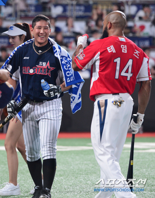 17일 수원 케이티위즈파크에서 2015 올스타전이 열렸다. 홈런레이스 대회가 펼쳐졌다. 결승 레이스에서 11개의 홈런을 기록한 황재균이 테임즈와 하이파이브를 나누고 있다. 홈런레이스에는 에릭 테임즈(NC)부터 '2010년, 2014년 우승자' 김현수(두산)까지 8명의 타자들이 도전장을 내밀었다. 수원=송정헌 기자 songs@sportschosun.com/2015.07.17