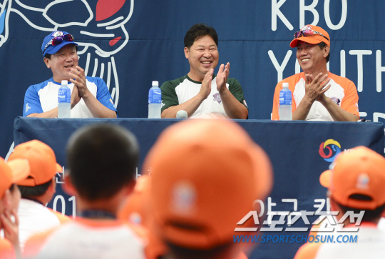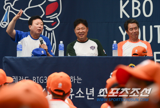 한국야구위원회(KBO)가 처음으로 개최한 프로야구 레전드와 함께하는 유소년 야구캠프. 이 뜻깊은 행사가 18일부터 2박3일의 일정으로 경기도 연천 고대산베이스볼파크에서 이어지고 있다. 19일 2일차에는 선동열 전 KIA 타이거즈 감독, 이만수 전 SK 와이번스 감독, 김시진 전 롯데 자이언츠 감독 등 레전드 감독들의 야구 교실과 질의응답 시간이 있었다. 압권은 초등학생 선수들이 세 레전드 감독에게 궁금한 것을 묻는 '감독에게 묻는다' 시간. 진지한 질문부터 초등학생 눈높이의 기상천외한 질문이 감독들에게 배달됐다. 세 명의 감독은 어린 선수들을 위해 진지하게 답변을 했다. 이에 선동열팀, 이만수팀, 김시진팀으로 나뉜 꿈나무들은 자신의 팀 감독을 위한 응원 구호와 응원가를 부르며 화답했다. 세 레전드 스타들의 입가에는 미소가 떠나지 않았다.