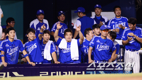 2015 프로야구 두산과 삼성의 경기가 19일 잠실 야구장에서 열렸다. 삼성 8회초 2사 만루에서 이지영이 2타점 적시타를 치자 덕아웃 동료들이 환호를 하고 있다. 잠실=조병관기자 rainmaker@sportschosun.com