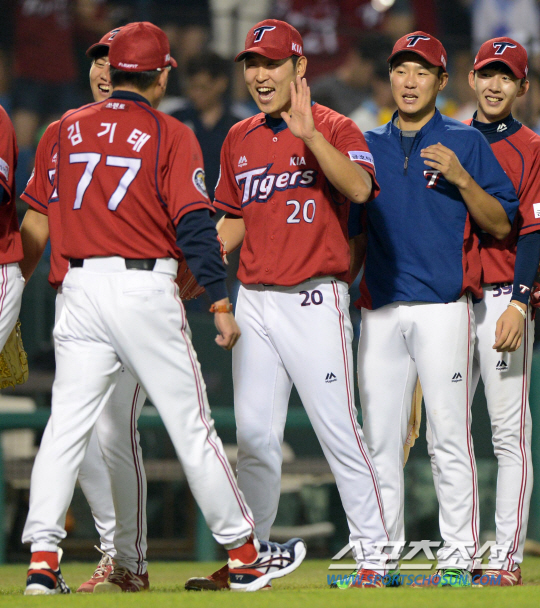 한화와 KIA의 2015 KBO 리그 주말 3연전 마지막 경기가 2일 대전 한화생명 이글스파크에서 열렸다. 9회말 1사 1,3루 한화 황선일의 내야땅볼때 합의판정 결과 아웃으로 번복되며 3대2로 승리를 만들어낸 KIA 선수들이 기쁨을 나누고 있다. 대전=허상욱 기자 wook@sportschosun.com/2015.08.02/