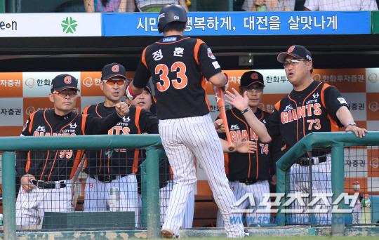 2015 KBO리그 한화이글스와 롯데자이언츠의 경기가 8일 대전 한화생명 이글스파크에서 열렸다. 롯데 정훈이 4회초 무사 1,2루에서 아두치의 적시타때 득점을 올리고 있다 . 대전=최문영 기자 deer@sportschosun.com /2015.08.08/