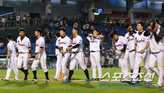 19일 대전 한화생명이글스파크에서 KBO리그 한화 이글스와 NC 다이노스의 경기가 열렸다. NC가 한화를 상대로 6대0 완승을 거뒀다. 6연패를 당한 한화 선수들이 경기 종료 후 고개를 떨구며 그라운드를 나서고 있다. 대전=송정헌 기자 songs@sportschosun.com/2015.08.19