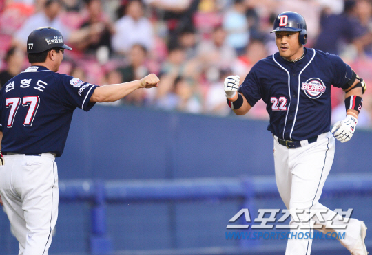 2015 프로야구 두산 베어스와 LG 트윈스의 경기가 21일 잠실구장에서 열렸다. 2회초 무사 두산 홍성흔이 좌월 솔로포를 터트리고 들어오며 전형도 코치의 축하를 받고 있다. 두산은 선발투수로 3승 방어율 1.88의 허준혁을 내세웠다. LG에서는 3승 8패 방어율 4.91의 류제국이 선발로 등판했다. 잠실=정재근 기자 cjg@sportschosun.com