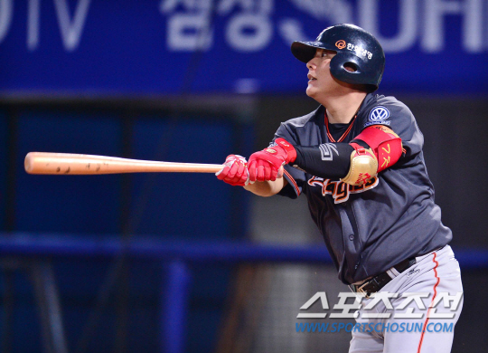 16일 오후 포항 야구장에서 2015 프로야구 삼성과 한화의 경기가 열렸다. 5회초 1사 만루서 한화 김태균이 2타점 중전안타를 치고 있다. 포항=김경민 기자 kyungmin@sportschosun.com