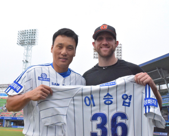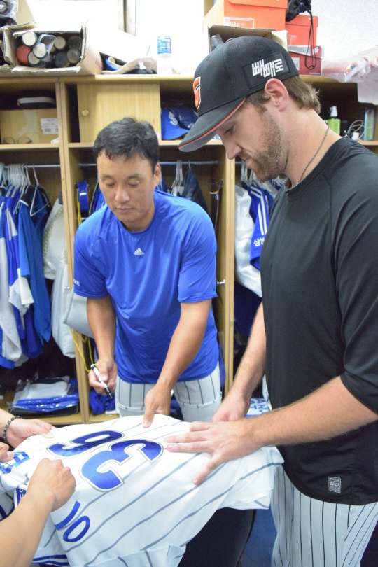 롯데 자이언츠 에이스 린드블럼(28)이 삼성 라이온즈 간판 스타 이승엽(39)의 사인을 받았다.