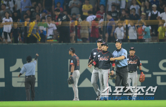 이어 2사 1루에 나온 필이 중견수 쪽으로 안타성 타구를 날렸다. 그런데 이용규가 전력 질주해오며 이 타구를 걷어올렸다. 이용규는 타구를 잡자마자 아웃이라는 제스추어를 취했다. 하지만 심판진의 판정이 엇갈렸다. 윤상원 2루심은 안타를 선언했다. 그러자 이용규는 합의 판정을 해달라는 손동작을 그리며 투수 마운드 근처까지 달려들어왔다. 이때 박기택 3루심은 또 아웃 콜을 했다.