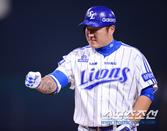 15일 오후 포항 야구장에서 2015 프로야구 한화와 삼성의 경기가 열렸다. 3회말 2사 2,3루서 삼성 최형우가 2타점 적시타를 친 후 김평호 코치와 주먹을 맞추고 있다. 포항=김경민 기자 kyungmin@sportschosun.com / 2015.08.15.