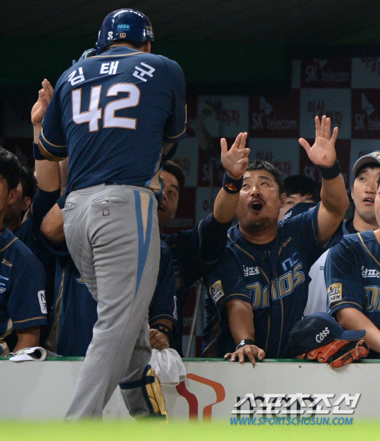 SK와 NC의 2015 KBO 리그 경기가 23일 인천 SK행복드림구장에서 열렸다. 9회초 NC 김태군이 SK 박희수의 투구를 받아쳐 우측담장을 넘어가는 솔로홈런을 날렸다. 홈인하며 동료들과 기쁨을 나누는 김태군. 인천=허상욱 기자 wook@sportschosun.com/2015.08.23/ |